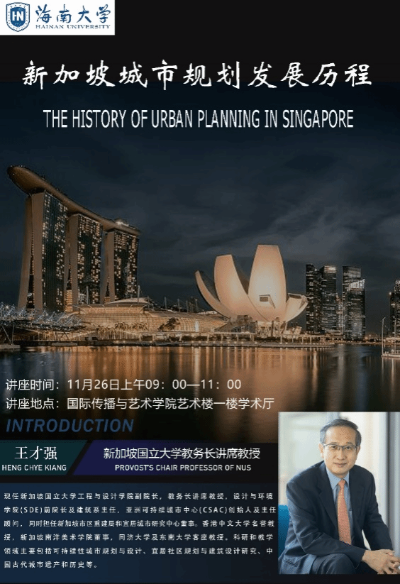 11月26日上午9:00 ,应yl6809永利集团邀请,新加坡国立大学教务长讲席教授、新加坡南洋美术学院董事、亚洲可持续城市中心创始人及主任顾问王才强(HENG CHYE KIANG)教授,在艺术楼学术厅开展以 “新加坡城市规划发展历程”为主题的学术讲座。