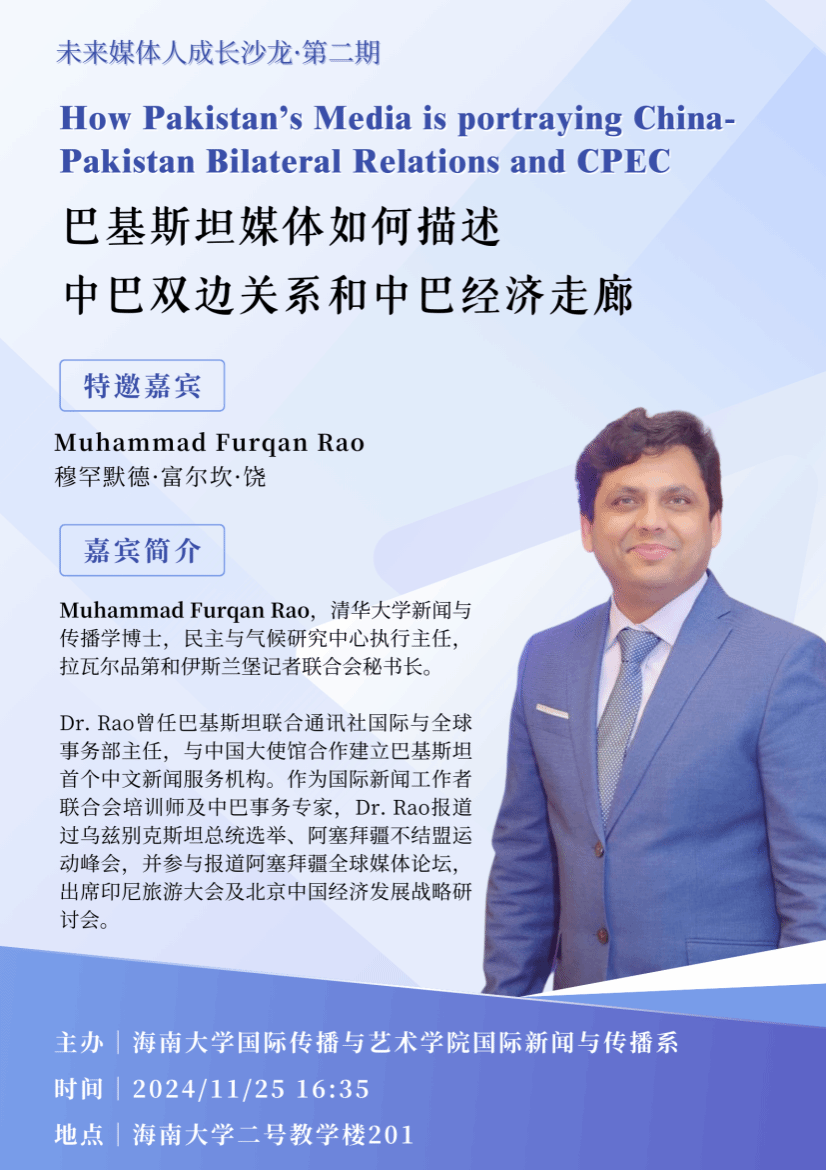11月25日下午,yl6809永利集团未来媒体人成长沙龙第二期在二号教学楼201教室举行,本次沙龙由清华大学新闻与传播学博士富尔坎·饶主讲“巴基斯坦媒体如何报道中巴双边关系和中巴经济走廊”,我院国际新闻与传播专业2024级全体学生参与讨论。富尔坎·饶的好友、巴基斯坦《黎明报》分社社长Bakhsh Behram一同参与了讲座。