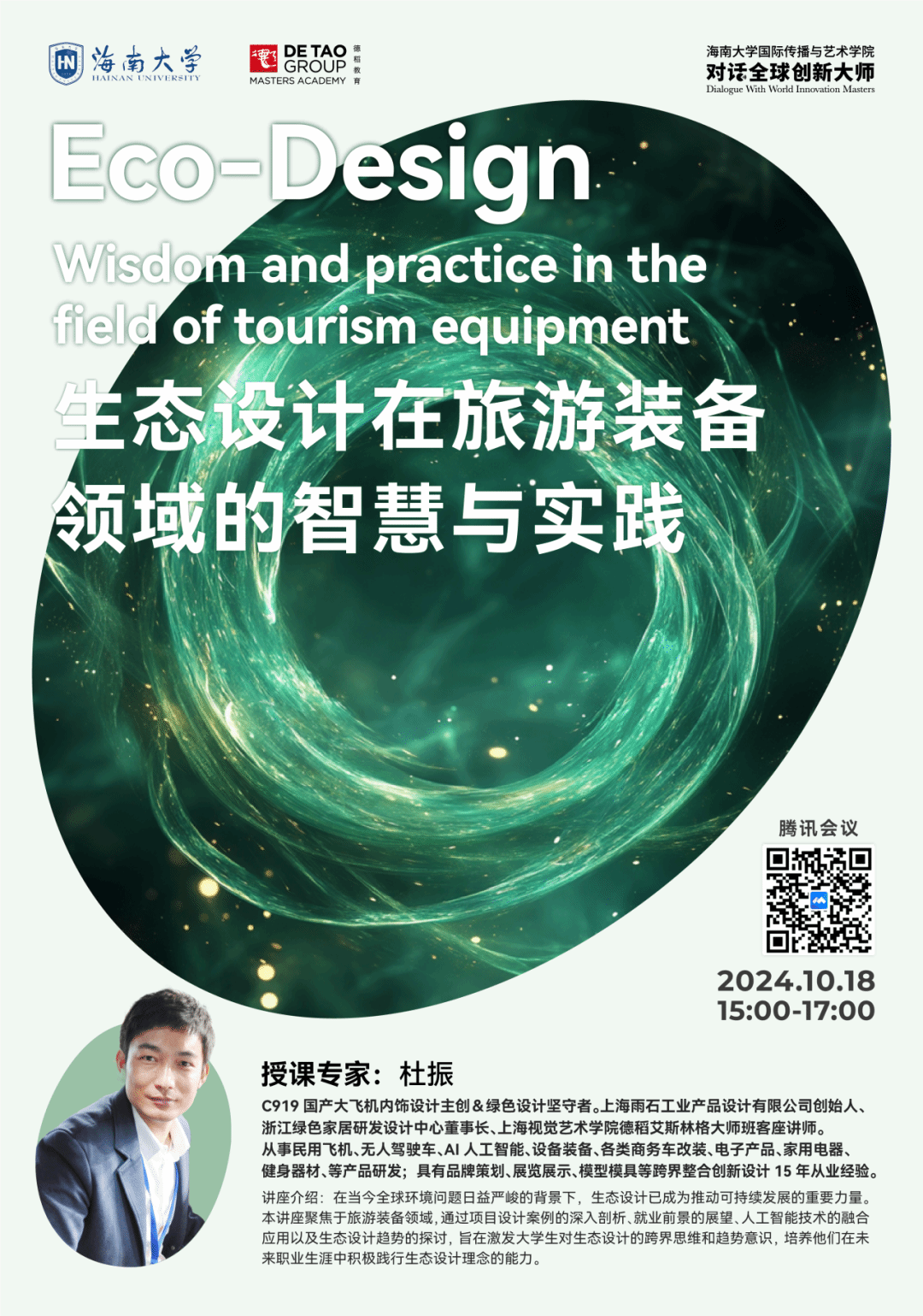 10月18日15:00,yl6809永利集团2024“对话全球创新大师讲座”《生态设计在旅游装备领域的智慧与实践》在线上举行,由上海雨石工业产品设计有限公司创始人杜振主讲,设计系专业教师方星星博士担任学术主持,线上线下近百名师生同时参与。