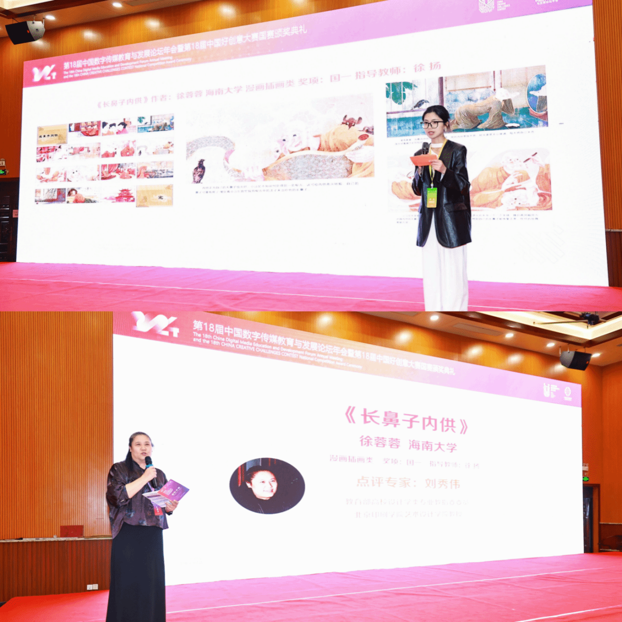 我院学生徐蓉蓉荣获国赛一等奖,并作为获奖嘉宾邀请上台进行作品创作分享。教育部高校设计学专业教指委委员、北京印刷学院艺术设计学院教授刘秀伟现场点评认为:这部插画作品在艺术风格、主题表达、技术手法、情感传达以及文化内涵等多个方面都表现出色,是一次成功的艺术创作实践。