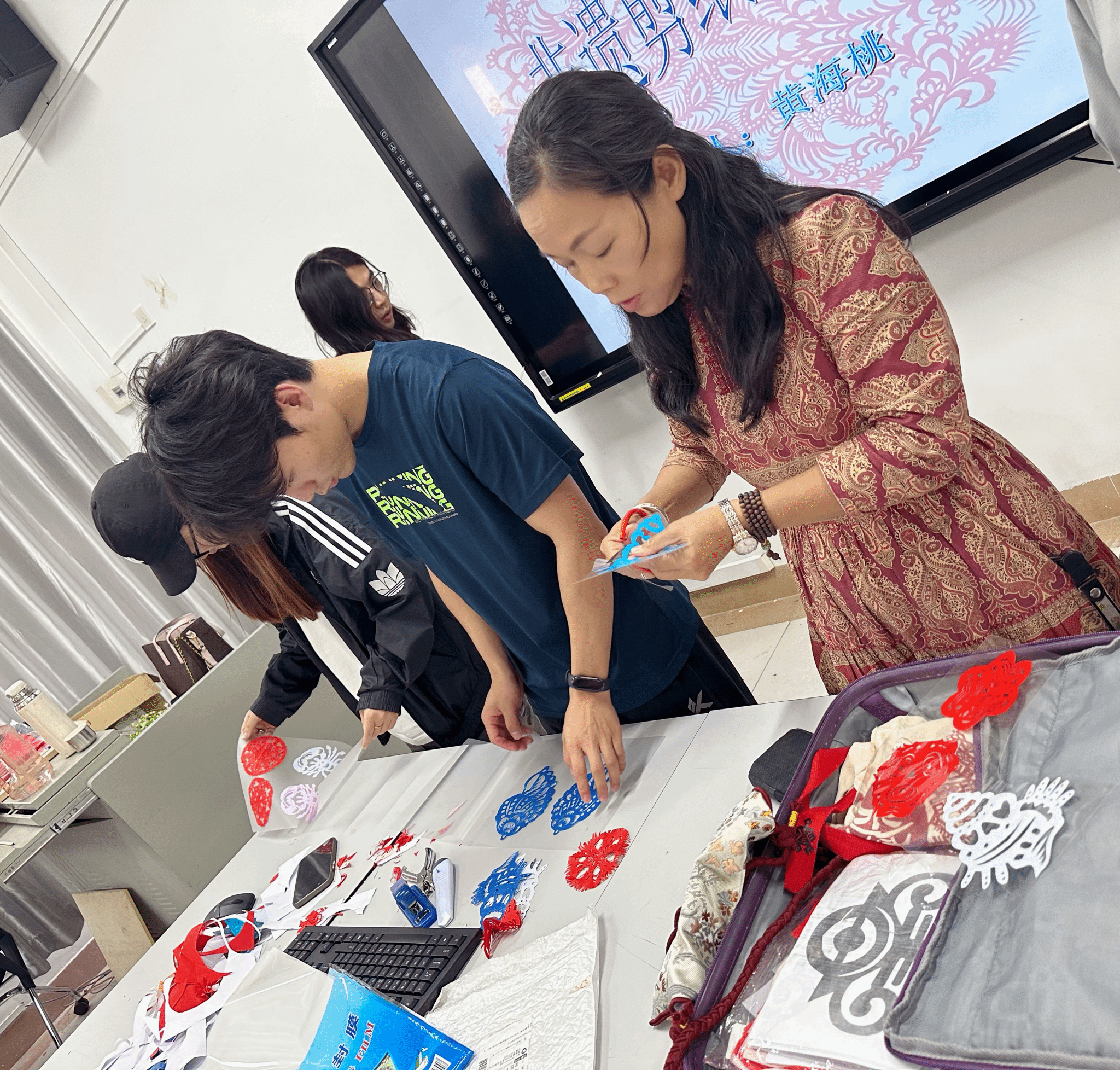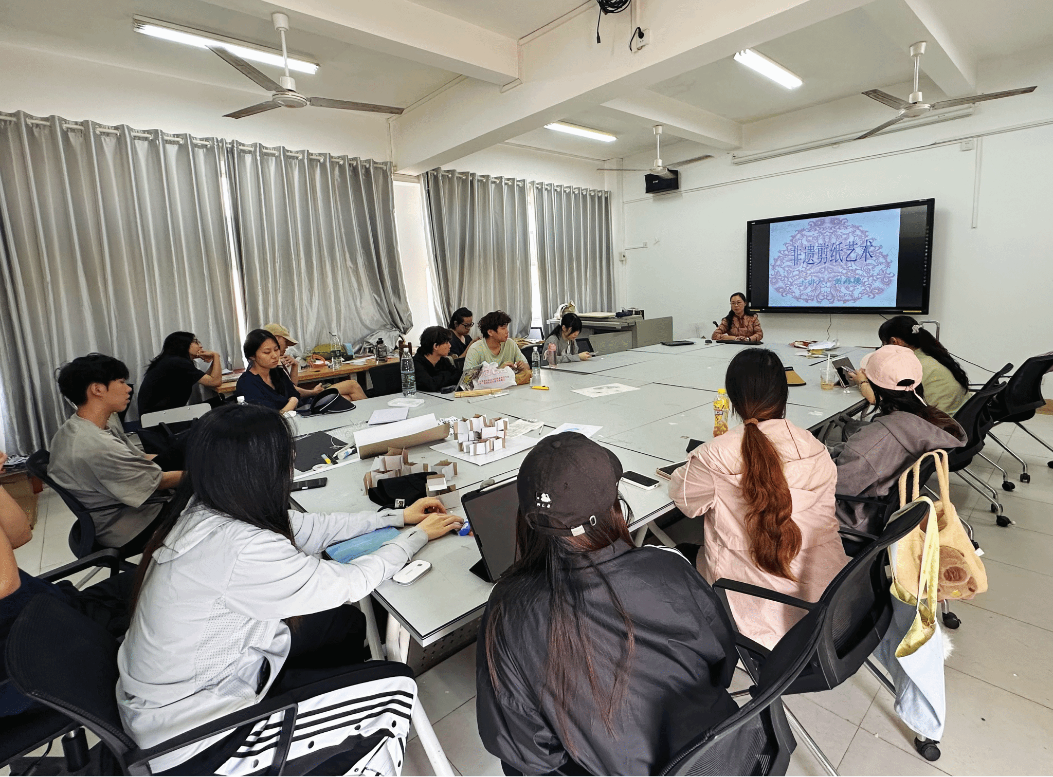 2025年3月26日下午,海南省剪纸学会会长、省级工艺美术大师、非遗传承人黄海桃应邀走入我院设计系大三课程—《旅游产品设计与制作》的课堂,与课程主讲教师张哲共同探索了剪纸艺术与海南文旅设计的融合路径。课程以“非遗活化+设计创新”为核心,通过理论讲授、技艺示范与创作实践,引导学生挖掘剪纸语言的地域表达潜力,现场气氛热烈。