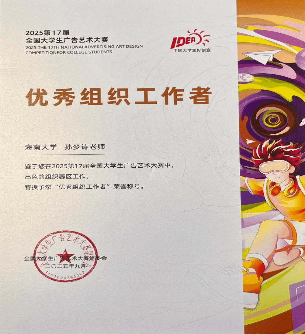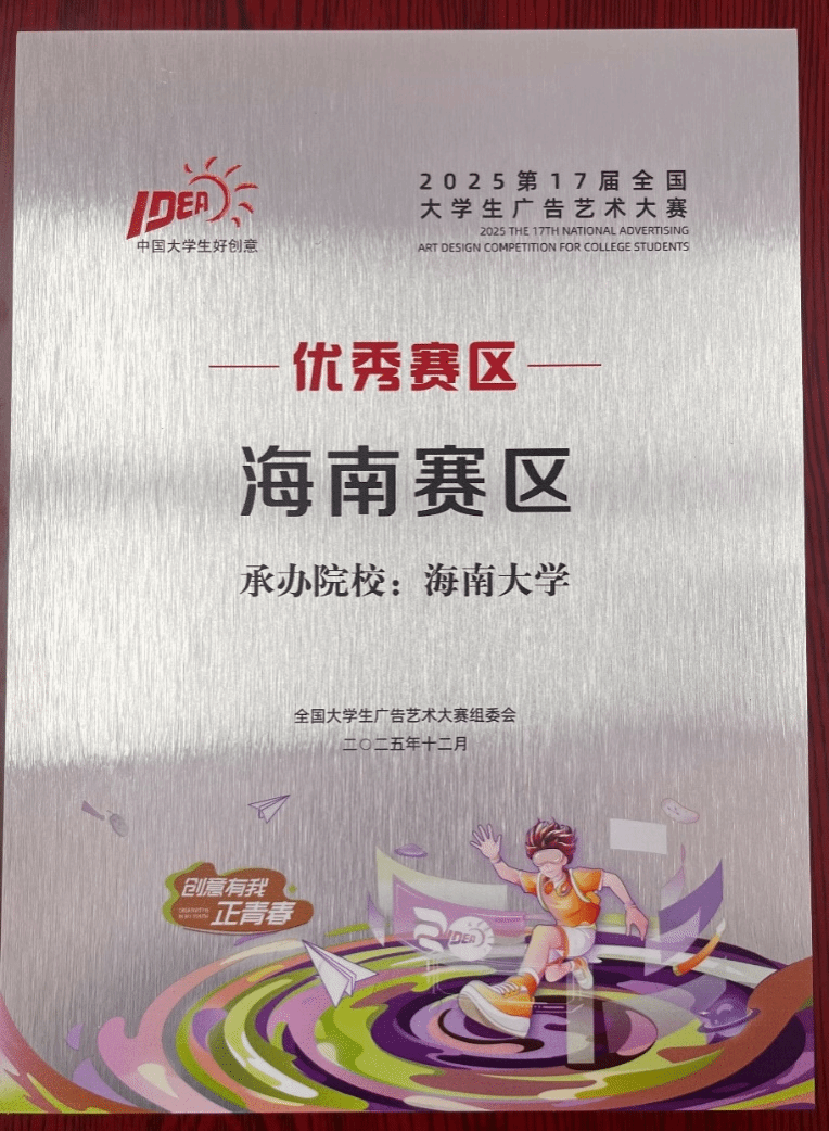 在本届大赛中,我院师生团队积极备赛、踊跃参赛,凭借扎实的专业功底与蓬勃的创造力,历经层层选拔与激烈角逐,斩获佳绩。其中,全国级奖项收获三等奖2项、优秀奖5项;省级奖项斩获一等奖6项、二等奖24项、三等奖35项,充分彰显了我院人才培养的扎实成效。同时,我院教师在赛事组织与区域推动工作中表现突出,获全国组委会高度认可—我院教师、大广赛海南赛区组委会秘书处孙梦诗,因卓越的组织协调能力被授予2025年度“优秀组织工作者”称号;我院教师、大广赛海南赛区负责人何晶娇,因在推动海南赛区成立、助力大赛走进海南高校、搭建省内外学子创意交流平台等方面的突出贡献,荣获 “最佳推动奖”,海南赛区同步获评“优秀赛区”称号。