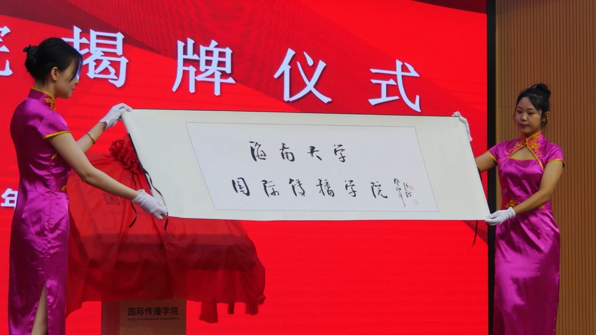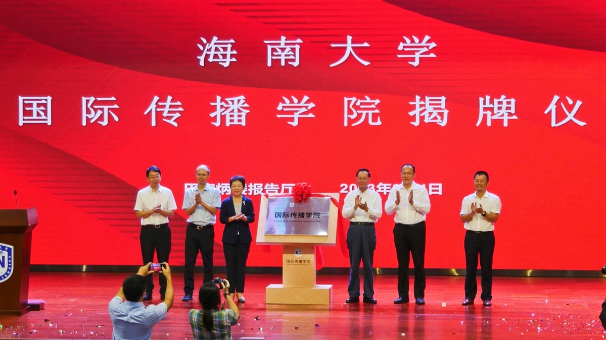 海南省委宣传部副部长蒋建民,海南省教育厅党委书记曹献坤,新华社海南分社社长陈良杰,yl6809永利检测中心党委书记符宣国,党委常委和校领导高佃恭、韩淑梅、谭勇出席,国际传播学院全体师生参加揭牌仪式。