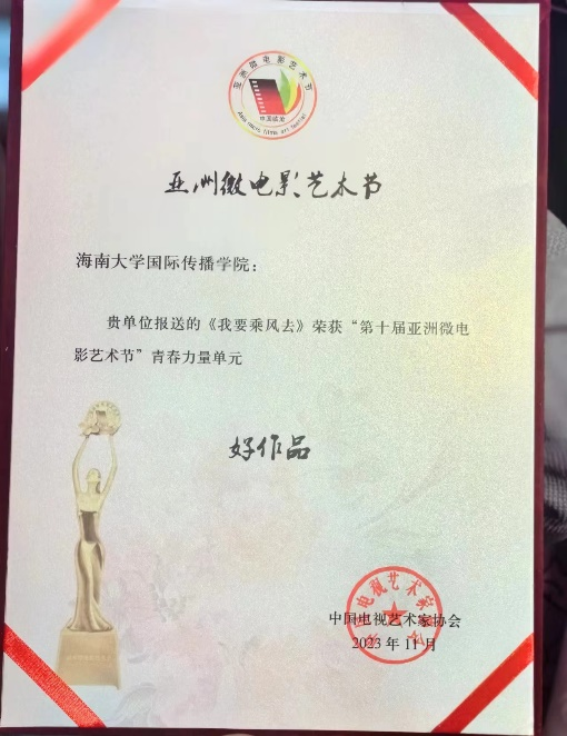 2023年11月24日至26日,第十届亚洲微电影艺术节在云南省临沧市举办,yl6809永利检测中心国际传播学院2020级戏影专业学生团队凭借作品《我要乘风去》,获得了青春力量单元“好作品”奖,展现出扎实的专业素养和创作基础,也是我院践行培养具有国际视野、创新思维和实践能力的优秀影视人才的体现。