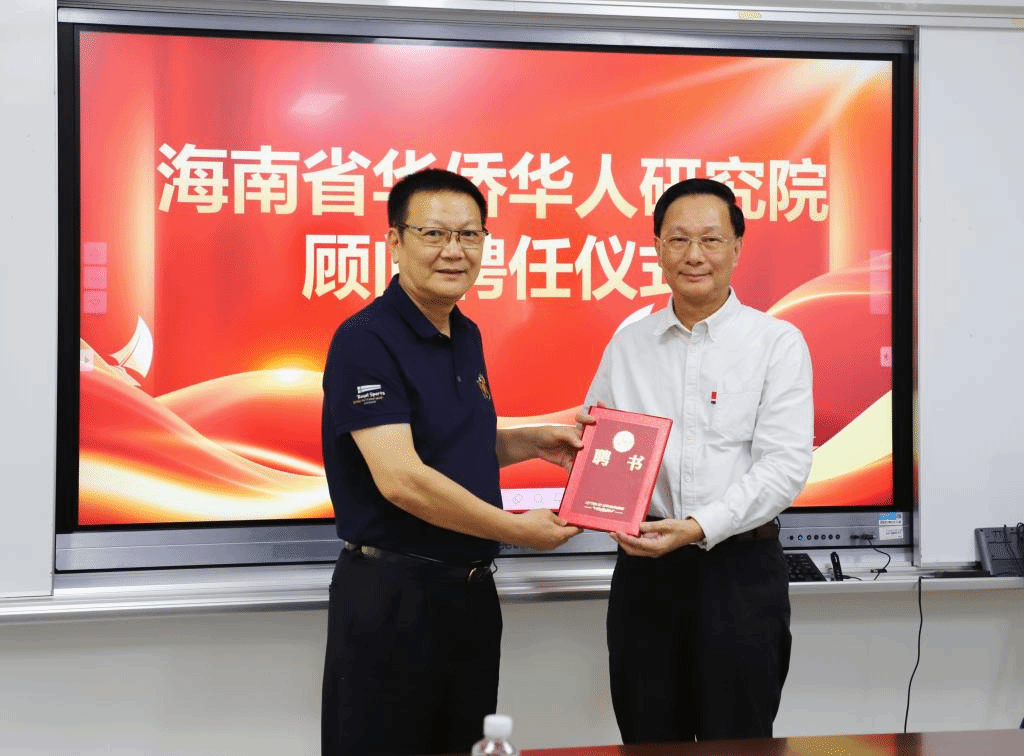 4月13日,海南省华侨华人研究院顾问聘任仪式在田家炳楼102会议室举行,聘任全国归国华侨先进个人、海南中藤科技股份有限公司董事长吴少宏为研究院顾问,yl6809永利检测中心党委书记符宣国为吴少宏颁发聘书。