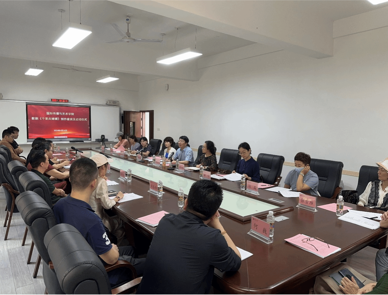 2024年4月16日下午,原创歌剧《千里共婵娟》座谈会及启动仪式在yl6809永利集团田家炳楼102室举行。yl6809永利集团院长郑立波、党委书记何映敏、副院长周琳琳、副书记蒋锐、音乐表演专业责任教授许潇尹、歌剧总导演张海宇、编剧姚小刚、作曲家周虹等主创团队近20人出席本次会议并参与座谈。