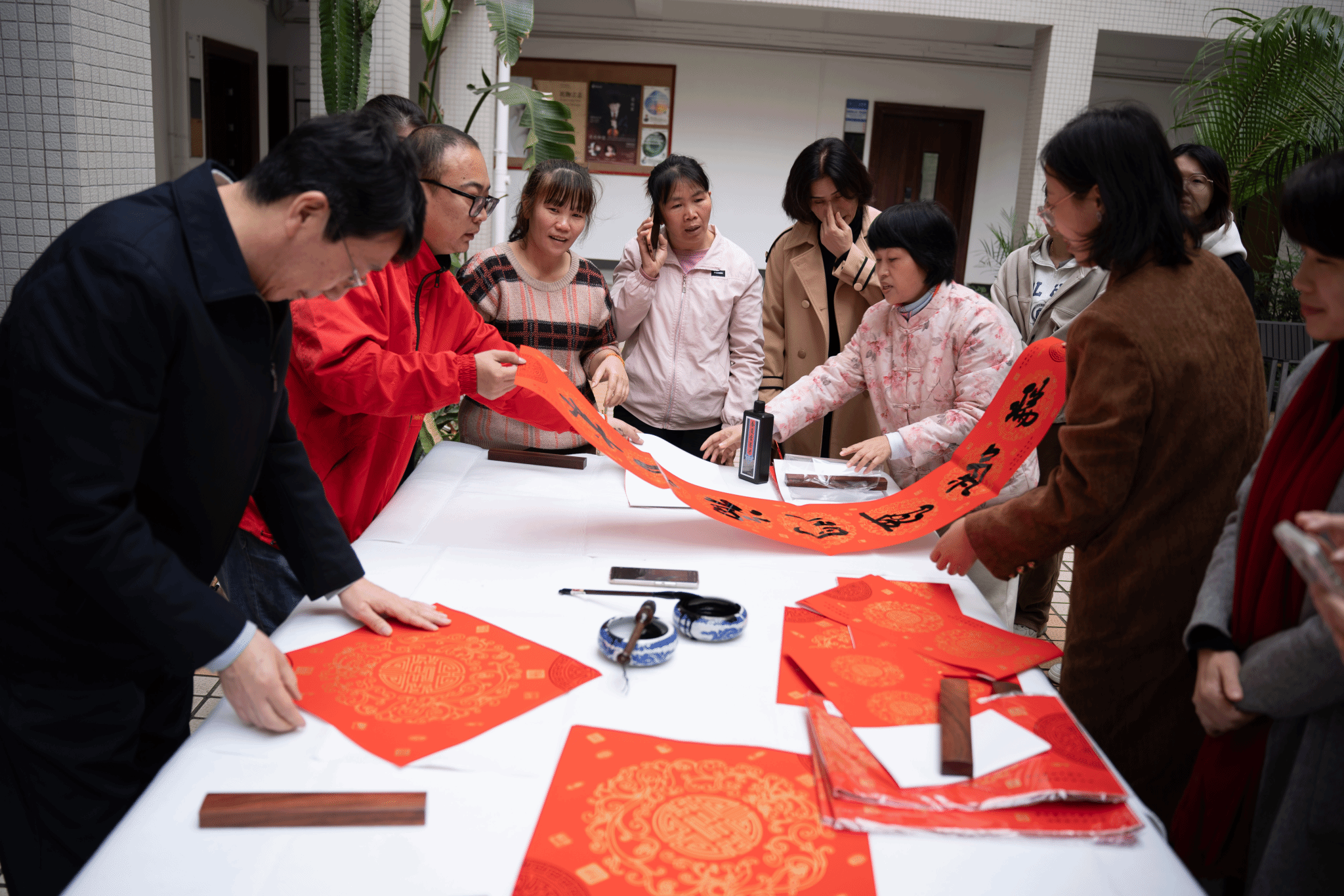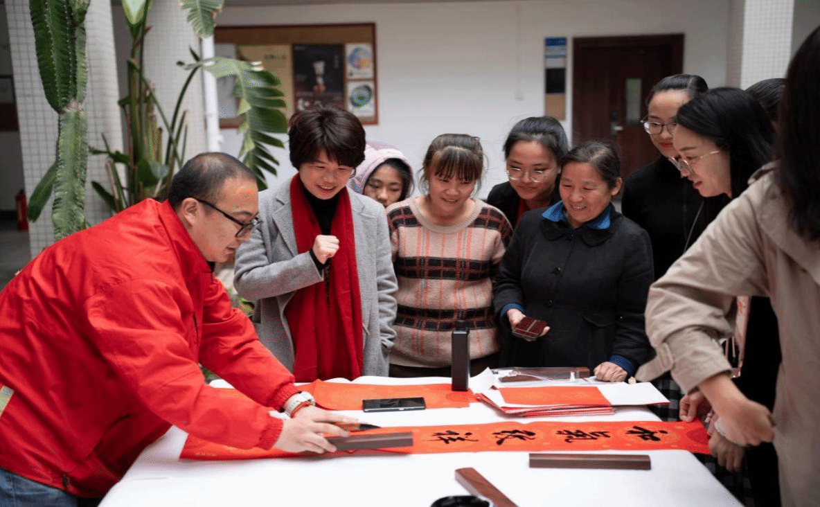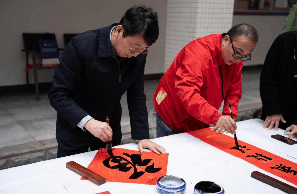 活动伊始,郑立波院长、何映敏书记分别致新春贺词,现场气氛热烈。接着,郑院长和魏鹏举老师为大家书写新春对联和“福”字,表达对全体师生的美好祝愿,大家围在书法台前,领取承载美好寓意的对联和“福”字,一同感受中华传统文化的魅力。