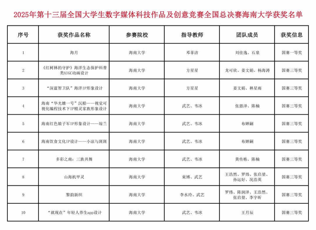 这些优异成绩的取得,不仅彰显了我院在设计学领域的教学成果,也激发了师生参与高水平专业竞赛的信心和期待。未来,我院将继续紧扣海南自贸港建设需求,为师生发展搭建更广阔的平台,推进院系学科交叉融合,努力培养具有国际视野的创新创意人才。