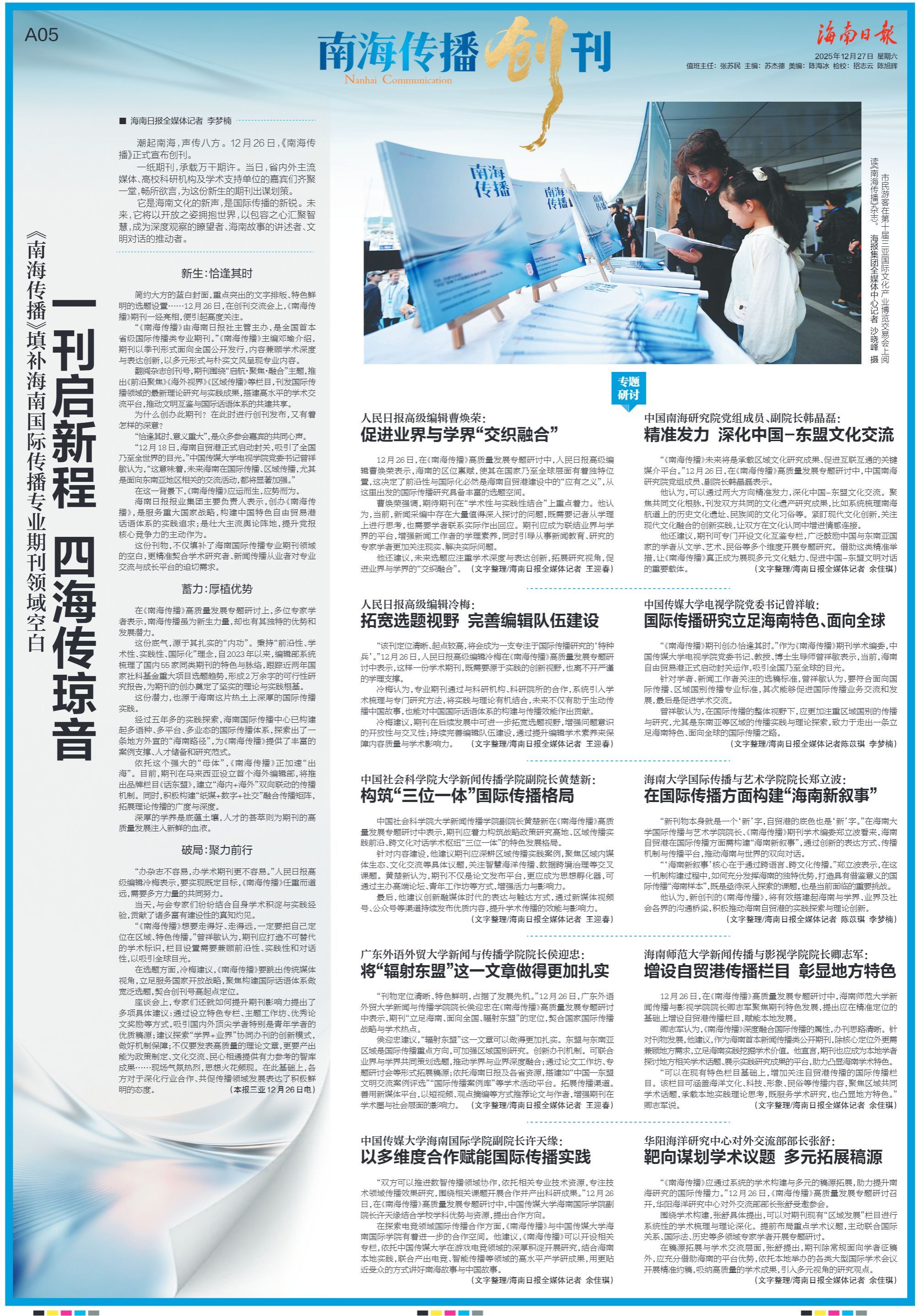 “《南海传播》未来将是承载区域文化研究成果、促进互联互通的关键媒介平台。”12月26日,在《南海传播》高质量发展专题研讨中,中国南海研究院党组成员、副院长韩晶磊表示。